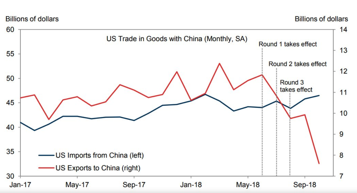This graph shows that once the 2nd round of tariffs came into play, imports went up and exports sharply declined.