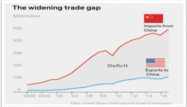 Firstly, let us analyse the ongoing trade war between the US and China. As I had mentioned before, President Trump hit China with tariffs so that there would be an increase in the demand for domestic American goods and because the US government came to realize that their imports from China were far greater than what they exported to China. The US and China have been top trading partners since 2015 with China boasting nearly $500 billion in total exports and imports which is roughly about 15% of total U.S trade. In 2017, the total US merchandise trade with China was $636 billion which made China the US’ largest trading partner. Although this was the case, the US deficit was just increasing and it was one point that Donald Trump brought up in his election campaign.